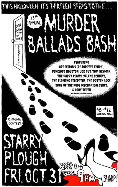 9:05 HAPPY CLAMS: This power wielding quartet of Paul Pot, bass driver Gail Todd, drummer Rawbird, and the newest little clam, Larry Levy (former member of Roy Loney & the Phantom Movers and lead singer of his own band, the Bonapartes) will get their foot bloodied in the door with some of their favorite dark songs.
