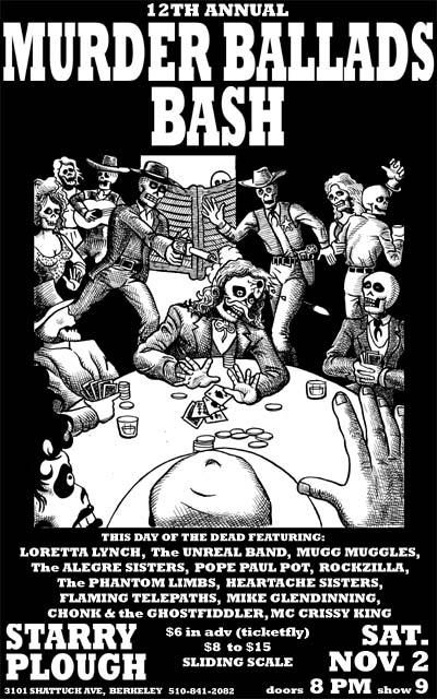 9:45 LORETTA LYNCH: Loretta Lynch is a 5 piece Eastbaynian outfit at home in the dark chasm between tear-in-your-beer sorrow and knife-in-the-back revenge. Adding his brilliant brass to the ruckus for this one will be Dan Plonsey (Plonsey Scheme).